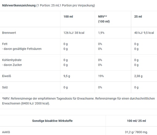Wasser, L-Arginin-alpha-Ketoglutarat, Säuerungsmittel (Zitronensäure), Aromen, Süßungsmittel (Acesulfam-K, Sucralose), Konservierungsmittel (Sorbinsäure), Farbstoff (Karmin).